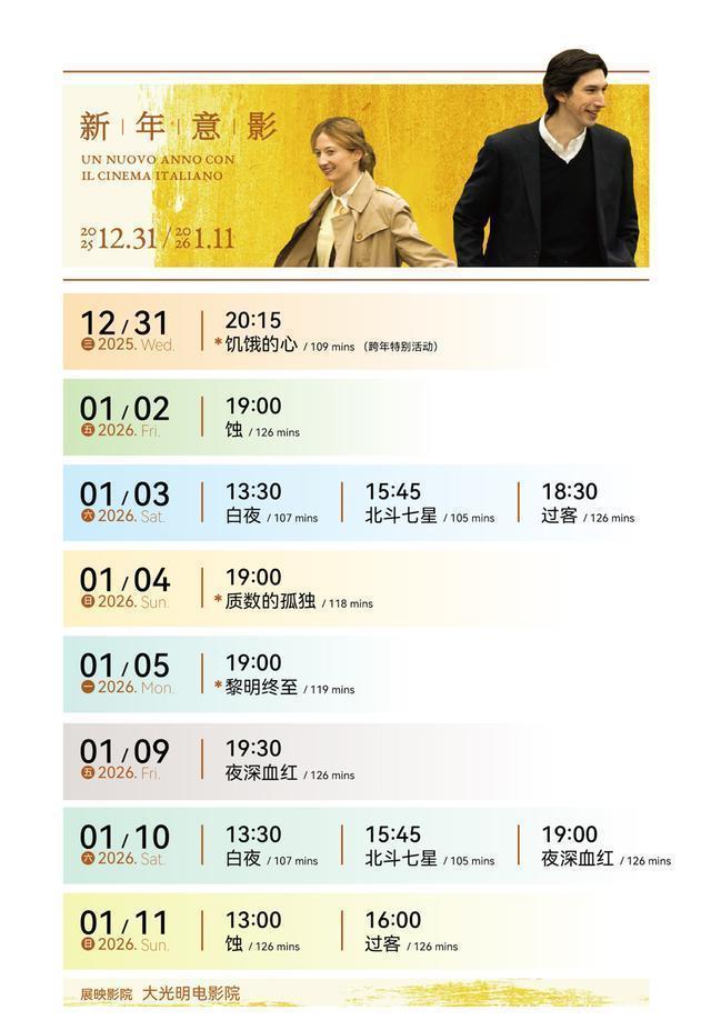 在2025年与2026年相交之际,上海艺术电影定约将在2025年12月31日至2026年1月11日在上海大光明电影院举办的“新年意影——意大利电影周”。 本次“新年意影——意大利电影周”展现多位意大利电影导演米灵活基罗安东尼奥尼、卢基诺·维斯康蒂、达里奥·阿基多等的五部极品,以及备受嘉赞确现代意大利导演萨维里奥·科斯坦佐的三部作品。导演萨维里奥·科斯坦佐与威尼斯电影节最好女演员阿尔芭·洛瓦赫届时将现身映后谈判,与不雅众碰头。 本次“新年意影——意大利电影周”带来的八部佳作包括: