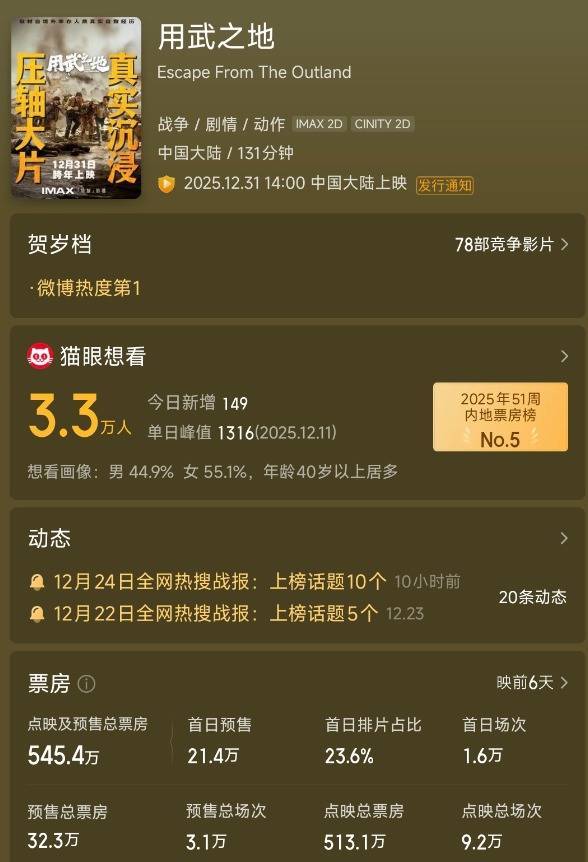 现在来看,真确有望在该档期斩获票房冠军的影片,并非上述几部,而是申奥的新片《用武之地》。其点映和预售票房已超 500 万,12 月 31 日认真上映时,好像会给电影市集带来不小的颤动。那么,该片究竟有哪些看点呢?