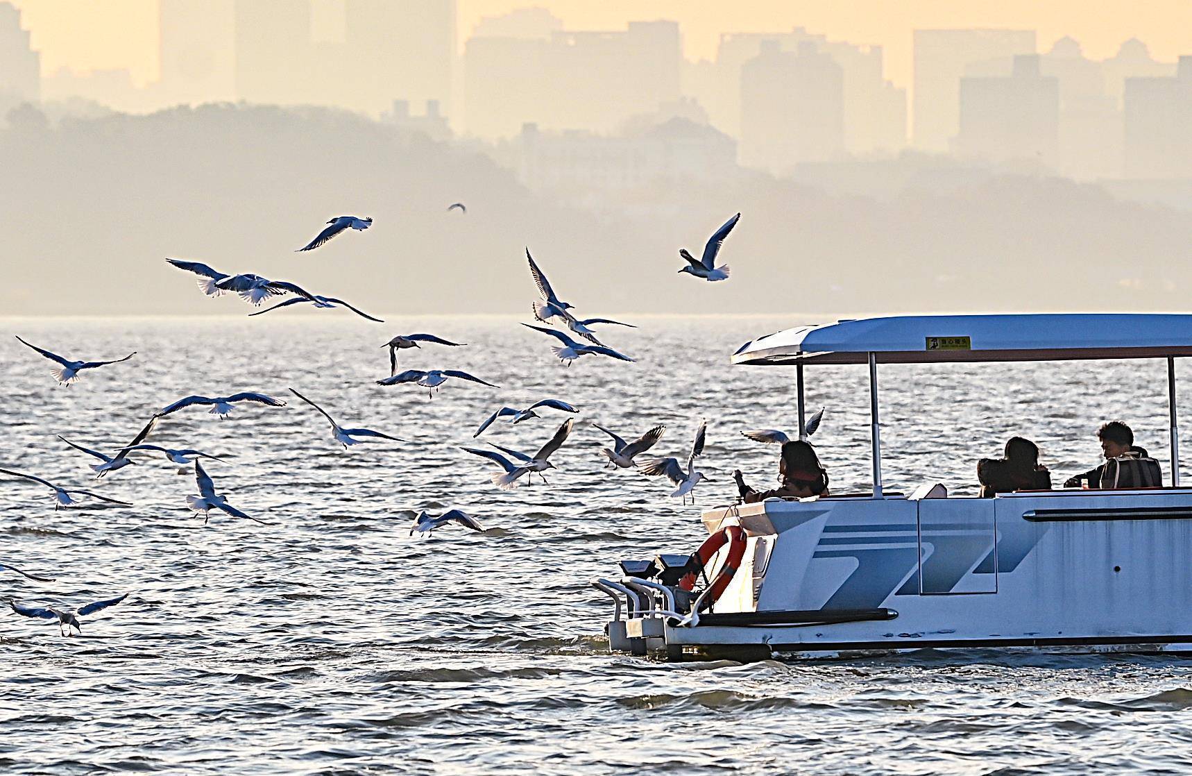 1月9日,很多市民搭客在武汉东湖磨山的湖边和往复楚风园与磨山的游船上喂红嘴鸥,引来成群的红嘴鸥抢食的景不雅。