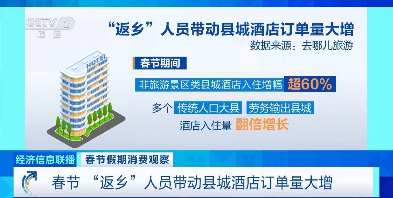 与此同期,返乡过年的年青东说念主也带来了新的耗尽习尚,让县城旅店迎来预订增量,数据剖析,春节时分,除了大城市、传统旅游景区,非旅游景区类县城旅店入住增幅超60%,多个传统东说念主口大县、劳务输出县城旅店入住量翻倍增长。