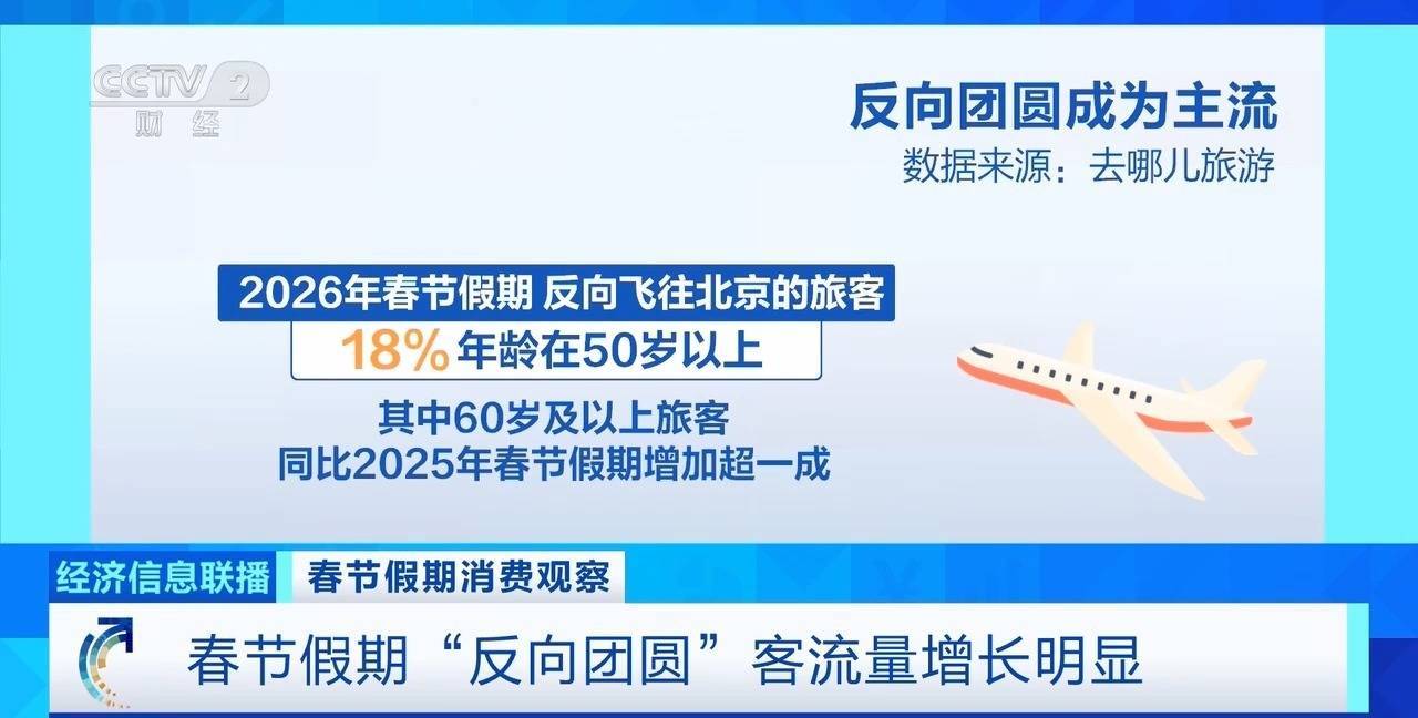 “反向团圆”从往年的小众选拔升级为主流潮水,成为本年春节文旅阛阓的一大亮点。在大城市职责的年青子女,接父母赶赴北上广深等一线城市过年。数据剖析,2026年春节假期,反向飞往北京的搭客中,18%年事在50岁以上,其中60岁及以上搭客同比2025年春节假期加多超一成。