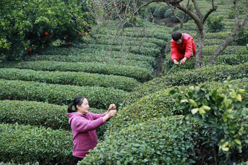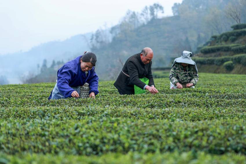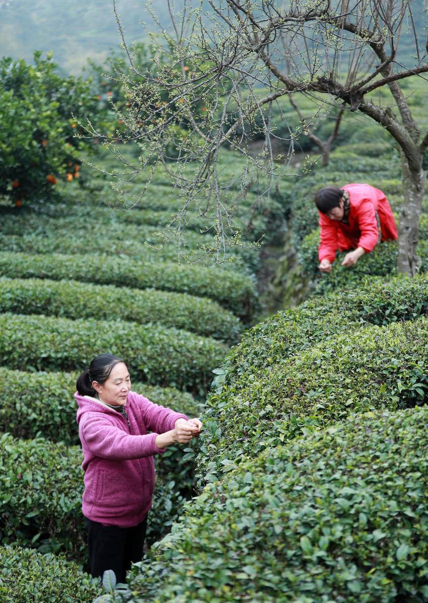 3月9日,茶农在湖北省秭归县茅坪镇中坝子村一茶园采摘茶叶嫩芽。