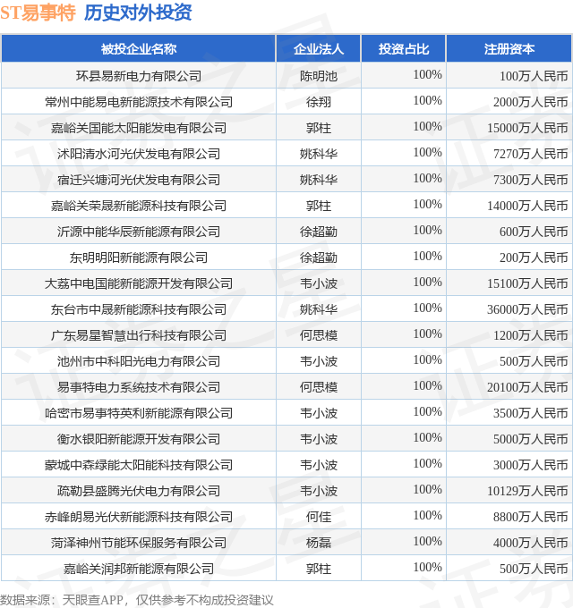 本站音问,阐述天眼查APP表示,ST易事特(300376.SZ)新增扫数对外投资事件,被投资公司为环县易新电力有限公司,法定代表东说念主陈明池,投资占比为100%。该公司从事电力、热力坐蓐和供应业,注册成本为100万东说念主民币。当今,ST易事特共存在对外投资83项,投资占比前20的花式见下表: