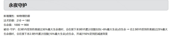 长夜看守加强:新增90点物理注视,生命和法防责难,被迫更容易触发,但触发还血更少。