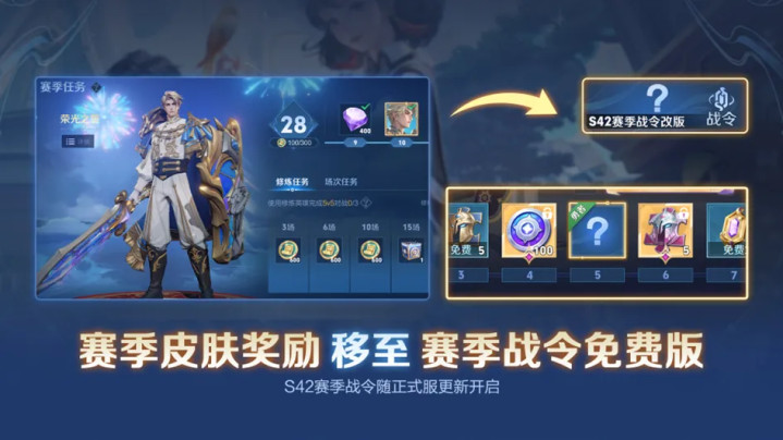 赛季任务和免费版战令会通,二者升级为赛季战令,完成任务升级赛季战令,即可免费取得S42赛季皮肤,且还不错将赛季皮肤升级为史诗品性。进阶版战令改为188点券,且移除了典藏版战令和勇者战令皮肤,即188进阶版战令只可取得一款史诗战令皮肤。