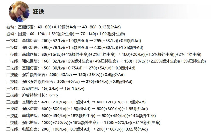 狂铁加强:前期回应小幅加多,1妙技在前期的伤害加多,2妙技的伤害加多,大招在后期的CD加多,护盾合手续时长裁汰,大招在后期的强化伤害加多,大招的护盾变薄。