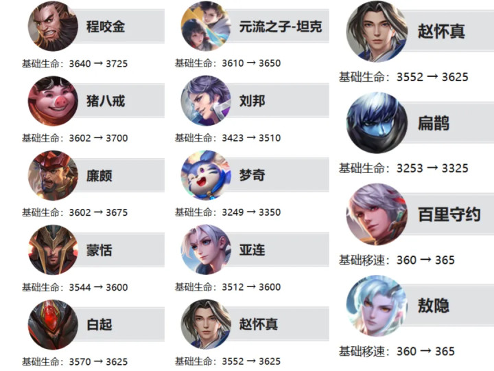 11位硬汉基础生命值加多,百里守约和敖隐的移速加多5点。