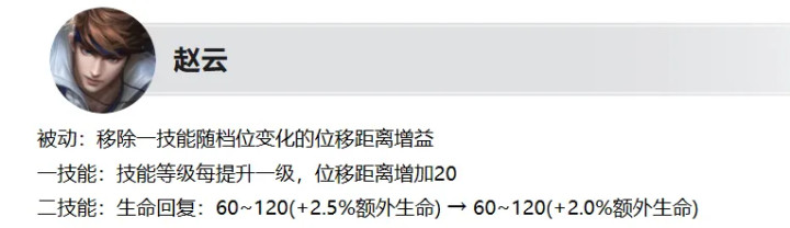 赵云加强:1妙技随妙技等第固定升迁位移距离,前期位移更短,后期位移更稳,上手更浅显,2妙技的回血稍稍责难,转型等第成长流。