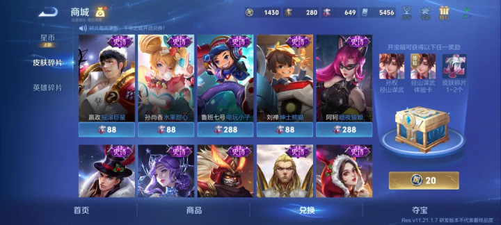 140多款惯例皮肤常驻上架皮肤碎屑商店,其中有20+款史诗皮肤可供公共免费兑换,皮肤碎屑不错从战令币商店免费获取。