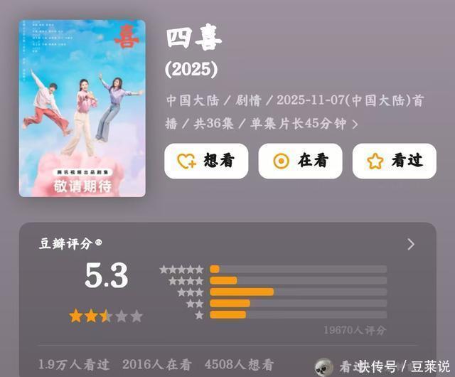 第二名,《四喜》,5.3分 本以为央视黄金档能有部像样的家庭剧,后果《四喜》平直刷新狗血下限,看完只想说“这哪是四喜,分明是四大劫难”!