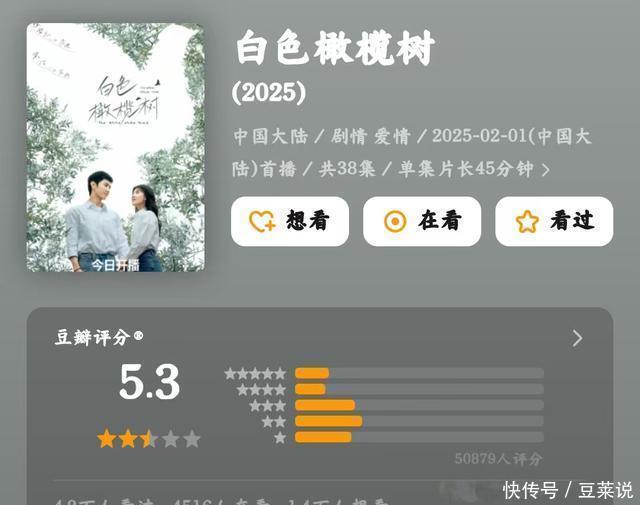 明明是现偶剧,却拍成了细密缺乏的样板戏,演员和扮装割裂,剧情和履行脱节,磕CP都得靠我方脑补残酷编剧赶早下岗。 第三名,《白色橄榄树》,5.3分 打着虐心战地恋的旗子,后果《白色橄榄树》拍出了一部让东说念主昏头昏脑的慢镜头MV。