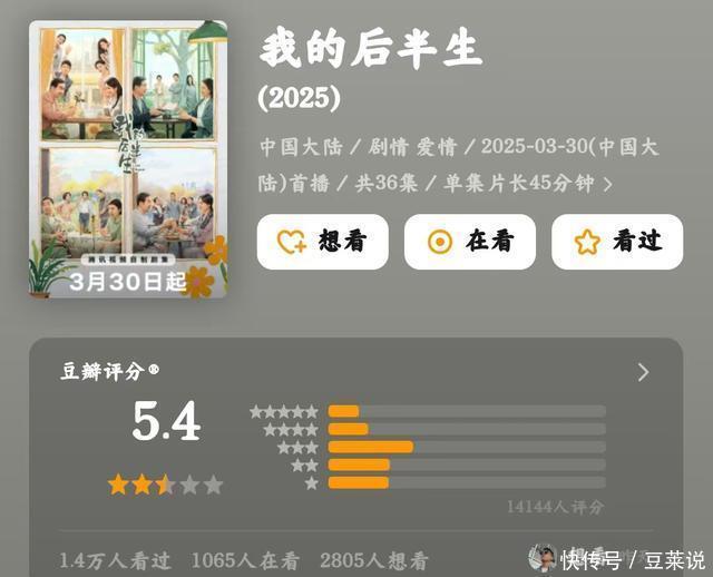 第五名,《我的后半生》5.4分 本以为央视播出的剧能有基本的底线,后果还在拍这种价值不雅跑偏的剧,实在让东说念主费解。 整部剧围着“70岁退休涵养是香饽饽”的离谱设定死磕。