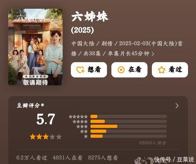 第六名,《六姊妹》,5.7分 正本以为《六姊妹》是部聚焦姐妹情深的家庭剧,后果剧情三不雅歪到离谱。 剧名后堂堂叫《六姊妹》,后果全剧围着“生不出男儿”这点死磕到底。