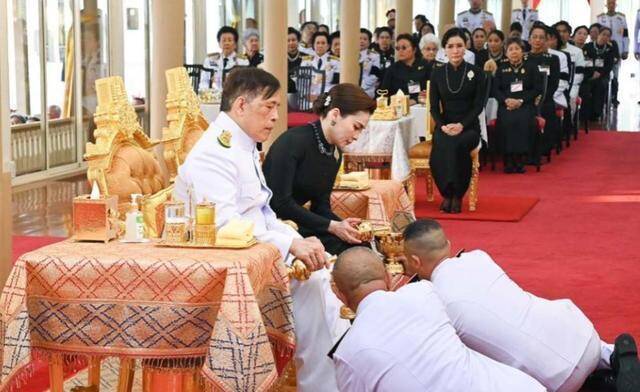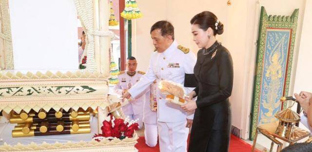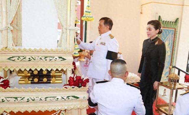 前不久,泰王玛哈与王后到寺庙进入一位宗亲的火化典礼。