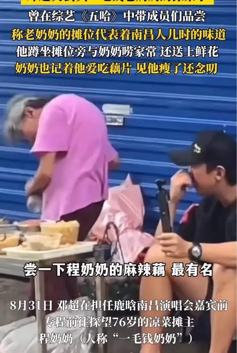 出席以外,邓超还去访问了“一毛钱凉菜奶奶”,老奶奶看着都驼背了、头发也白了。邓超打包了好多菜且归,老奶奶也铭刻他爱吃藕片。