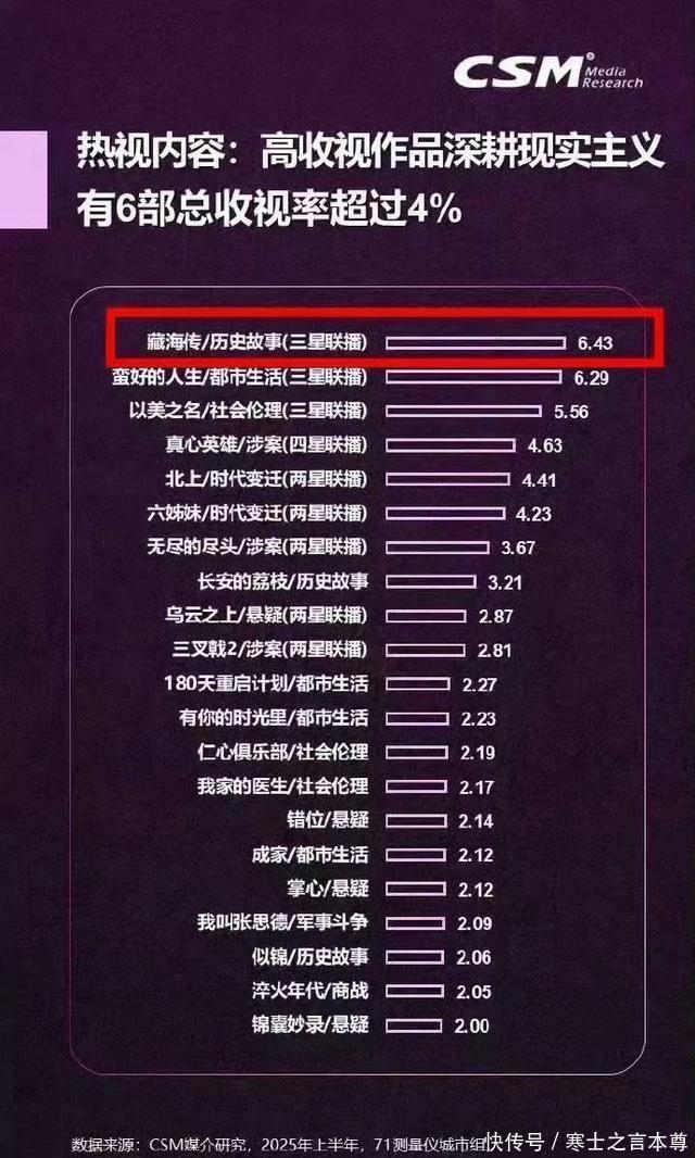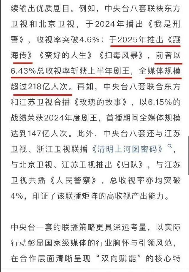 收视中国发布2024年至2025年8月播出的通盘电视剧CSM收视率排名,其中《藏海传》、《蛮好的东说念主生》、《扫毒风暴》、《玫瑰的故事》4部电视剧总收视率超6%,《以好意思之名》、《咱们的疆土》、《孤舟》总收视率超5%;《哈尔滨一九四四》、《我是刑警》、《归队》、《北上》、《六姊妹》等11部剧总收视率打破4%。这是24年以来CSM收视率最高的几部电视剧,其中,《藏海传》以6.43%总收视率斩获上半年剧王,全媒体规模跳跃218亿东说念主次。