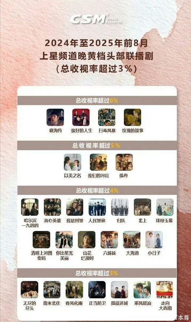 看CSM头部收视率榜单,上榜的剧大都是央视播出或央卫联播,比如说肖战主演的《藏海传》,不仅在CCTV8播出,还在北京卫视和东方卫视播出,后期还在安徽卫视和东南卫视播出,后期还在翡翠台及韩国电视台播出,这就不错看出市集对肖战主演,郑晓龙持导电视剧的敬重。 据收视中国、CSM统计,2024年至2025年8月时期上星频说念晚黄档开播的首轮剧中共有30部在71城市的总收视率打破3%,其中独播剧仅占3部,两星联播、三星联播离别占12部与13部,四星、五星联播各占1部;而总收视率超4%的剧集,则一齐为联播剧,是以联播款式在高收视区间的皆备上风。