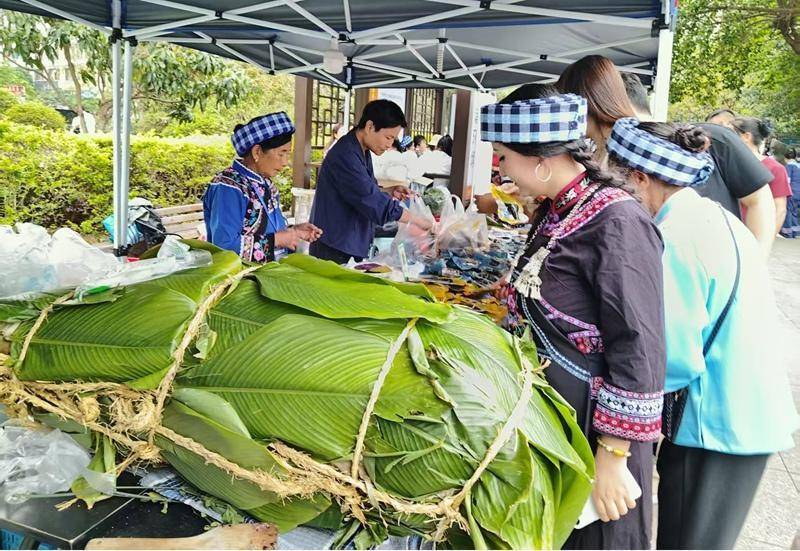 特质好意思食摊前蒸蒸日上,香气四溢。五色花糯米饭幽香扑鼻,凉剪粉、米豆腐、粽粑、褡裢粑等民族风范小吃让东说念主垂涎三尺、令东说念主沉迷。不少搭客还打包带走,要把独有的滋味让更多的一又友分享。