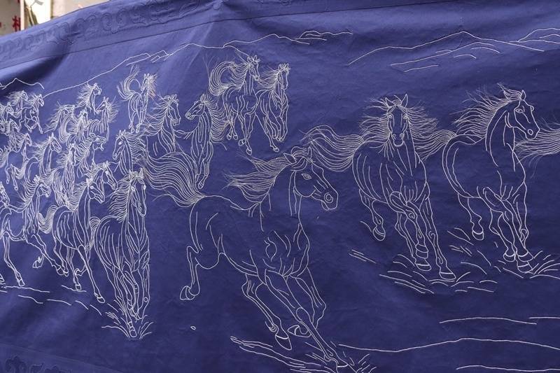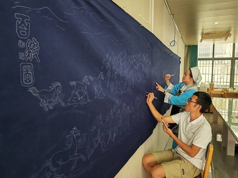 跟着贵州村马的抓续火爆,贵州省黔南州三都县围绕“村马”旅游推出的好多文创居品也接续上市。近日,一幅水族马尾绣作品《百骏图》备受关怀,随后获取了贵州水族文化博物馆保藏。
